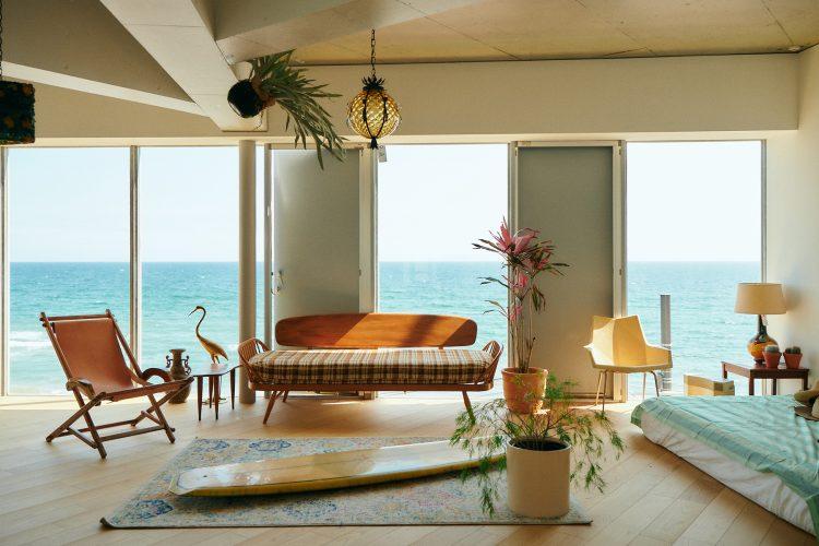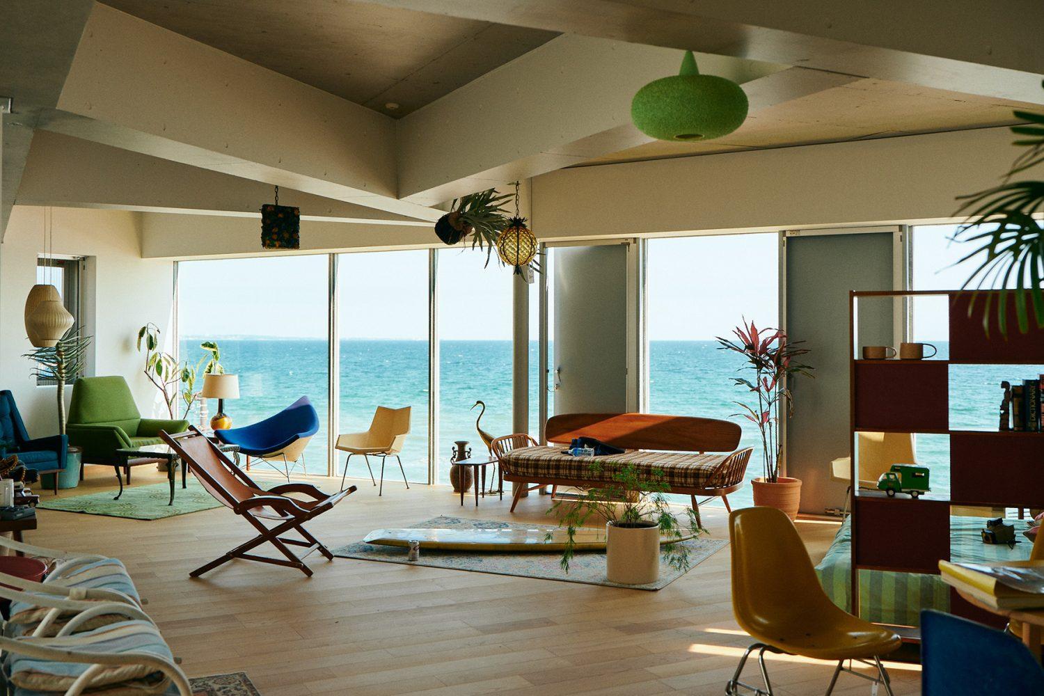 アメリカで買い付けられたミッドセンチュリー期の家具と海抜けの組み合わせが抜群!日没前には七里ヶ浜の夕日が室内を照らし、昼とは異なる雰囲気を味わうことができます。キッチンや開放的なルーフトップも備えており、ゆったりとした時間が流れる生活のシーンも撮れそうです。