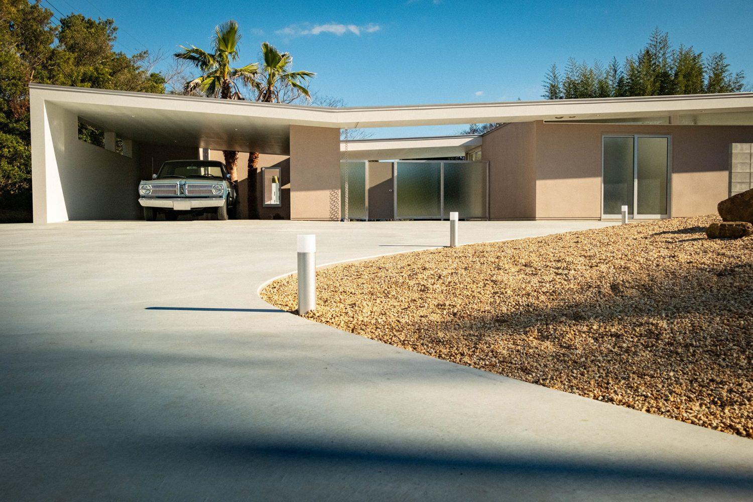 バタフライルーフの外観はカリフォルニアを彷彿とさせます。車のまま入り込めるモーテルエントランスやプールを備えており、異国情緒あふれる空間。海から徒歩1分のため、海でのロケーション撮影と併せての利用もおすすめです。